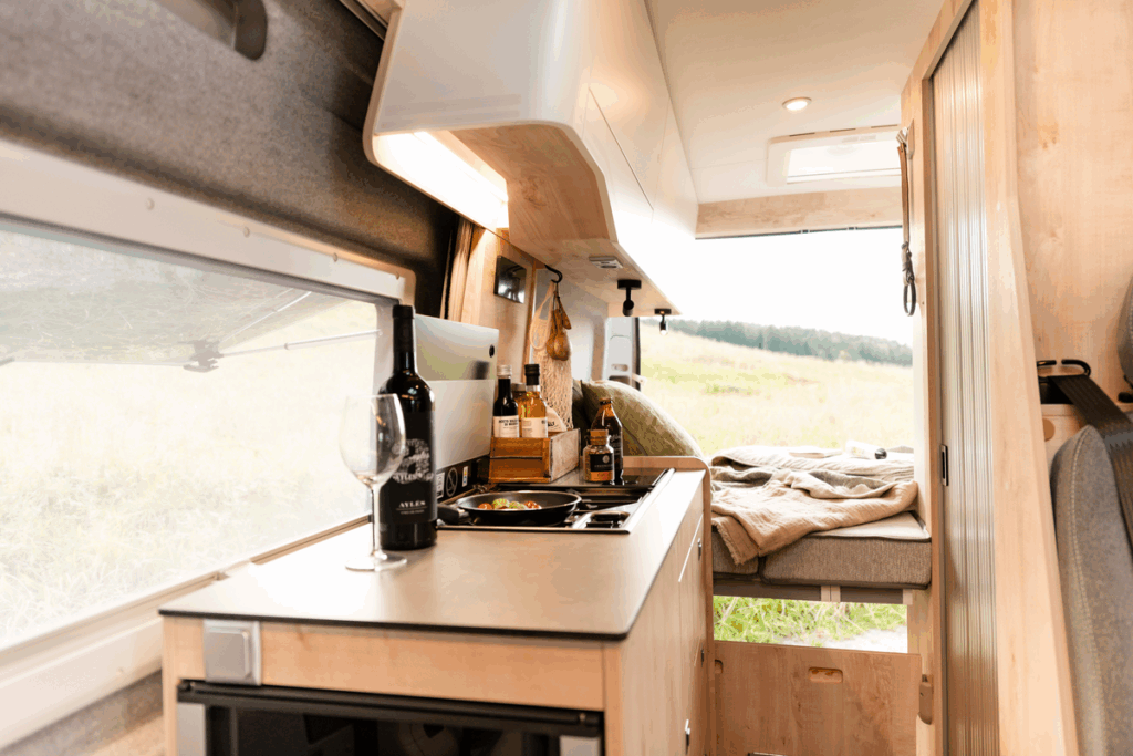 Für mehr Platz sorgt die klappbare Arbeitsfläche. Die Heizung ist serienmäßig unter der Sitzbank verbaut. Der neue Küchenblock bietet viel Stauraum für alle notwendigen Utensilien.