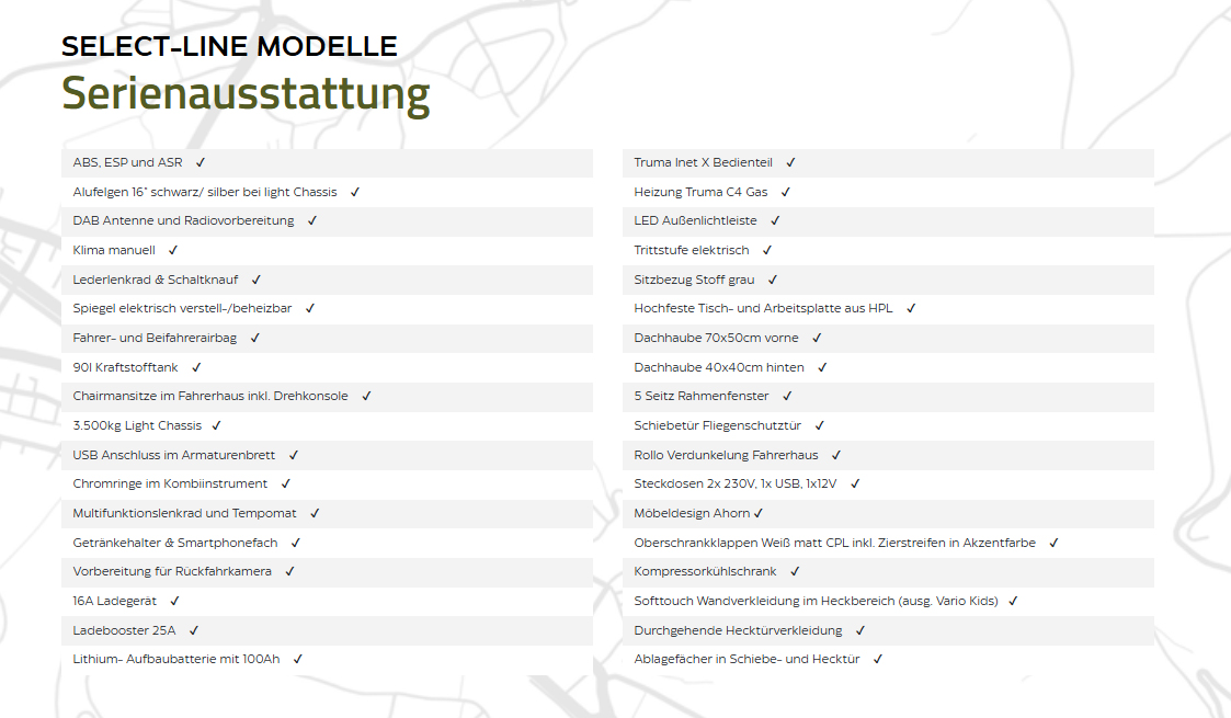 Auch bei unserem kleinsten Modell müssen Sie im Küchenbereich auf Nichts verzichten. Vor allem beim Tour ist der wunderbar von außen erreichbare und 100l große Kompressor-Kühlschrank mit Doppelanschlag erwähnenswert.  Auffällig ist der neue Anspruch an die Designmarke und den Komfort des Fahrzeuges. Das neue Möbeldesign mit abgerundetem Korpus und neu verbauten Premiumknöpfen der Staufächer fallen auf.