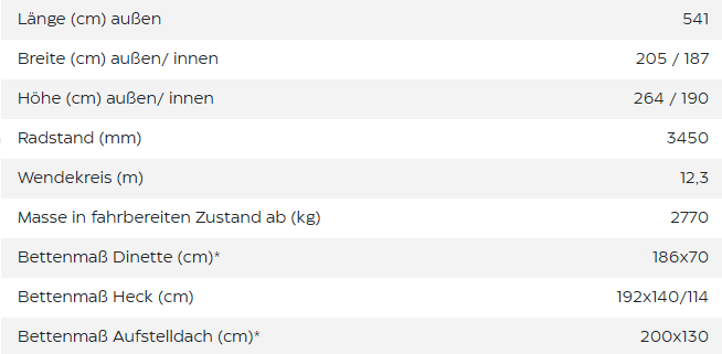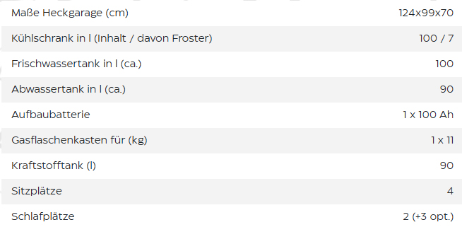 Der Tour trumpft durch seinen kurzen Radstand und der damit verbundenen Wendigkeit auf. Da wird jede enge Gasse zum Kinderspiel und trotzdem bietet er alles was Sie zum Reisen benötigen: 4 Sitzplätze, 2 feste Schlafplätze mit einer Bettengröße von 1,94 x 1,40 Metern und natürlich einem Waschraum sowie einer Küche, die Ihnen stets genug Platz für Ihren Urlaub bietet.