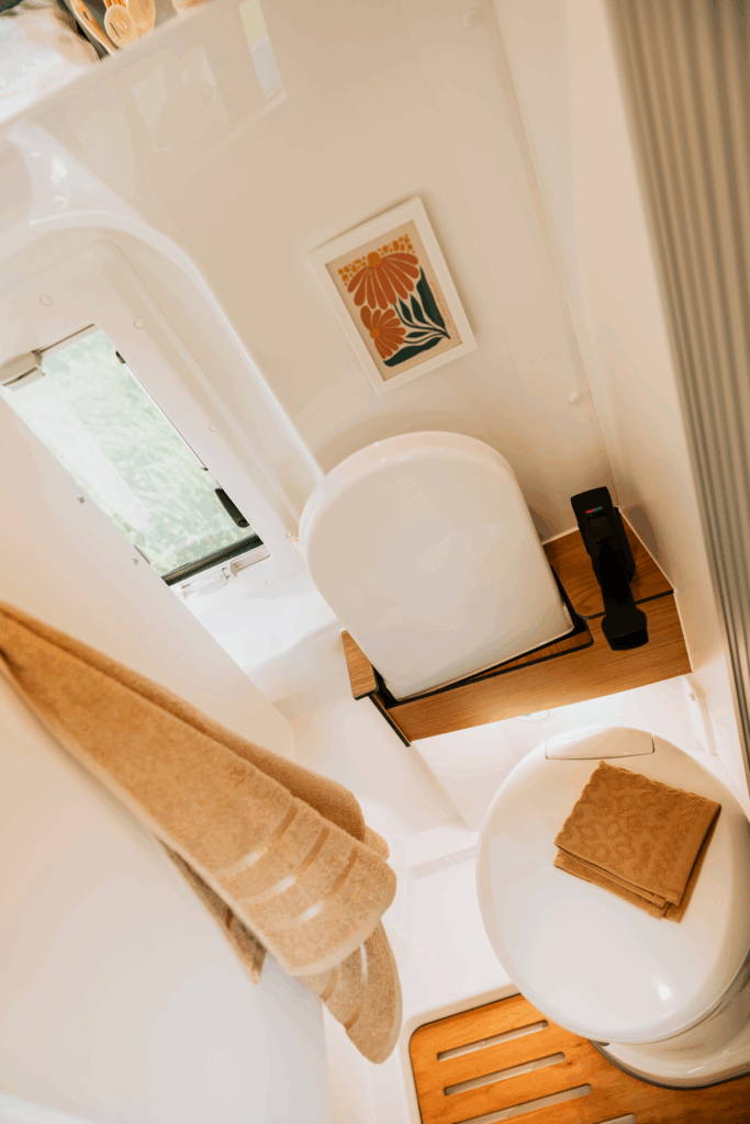 Durch die serienmäßige Lamellentür und die wasserabweisende CPL Beschichtung ist das Duschen ist im Tour 540 besonders komfortabel ohne lästigen Duschvorhang möglich. Ebenfalls wie bei den großen Modellen gibt es zwei Oberschränke im Bad und ein schwenkbares WC um mehr Stehfläche zu bekommen. Eine Neuheit ist das Vario-Badezimmer mit flexiblem Waschbecken, wodurch dank zwei Elementscharnieren ein Teil des Badbereiches nachts in den Schlafbereich integriert werden kann. Das macht für die Fahrzeuglänge beachtlichen Abmessungen des Bettes möglich.